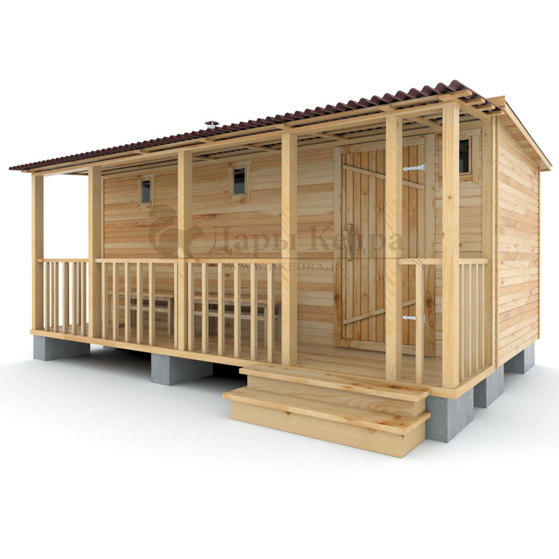 Каркасно-щитовая баня из кедра «Стандарт» с верандой Это классическая прямоугольная модель бани с тремя отделениями: предбанником, моечной и парилкой. Для удобства пользования предбанник оснащен лавочкой и вешалкой. В моечной находится лавка и полочка из кедра. Парилка оборудована двухуровневым открытым полком и печью. За счет небольших размеров баня нагревается не более 30 минут. На просторной веранде можно оставить вещи или отдохнуть после парения. Каркасно-щитовую баню можно заказать как в готовом, так и в разборном варианте. В разборной модели готовые щиты из кедра быстро собираются в полноценное строение, что также позволяет исключить лишний строительный мусор. Такая баня не требует полноценный фундамент, поэтому при необходимости ее можно перенести в другое место. Обращаем Ваше внимание, что в стандартную комплектацию бани входит полок открытого типа в парной. Дополнительно можно заказать полок закрытого типа или лавку! Древесина кедра насыщена эфирными маслами и фитонцидами, которые активируются при воздействии температур. Таким образом, парение в каркаско-щитовых банях из кедра становится еще полезнее.