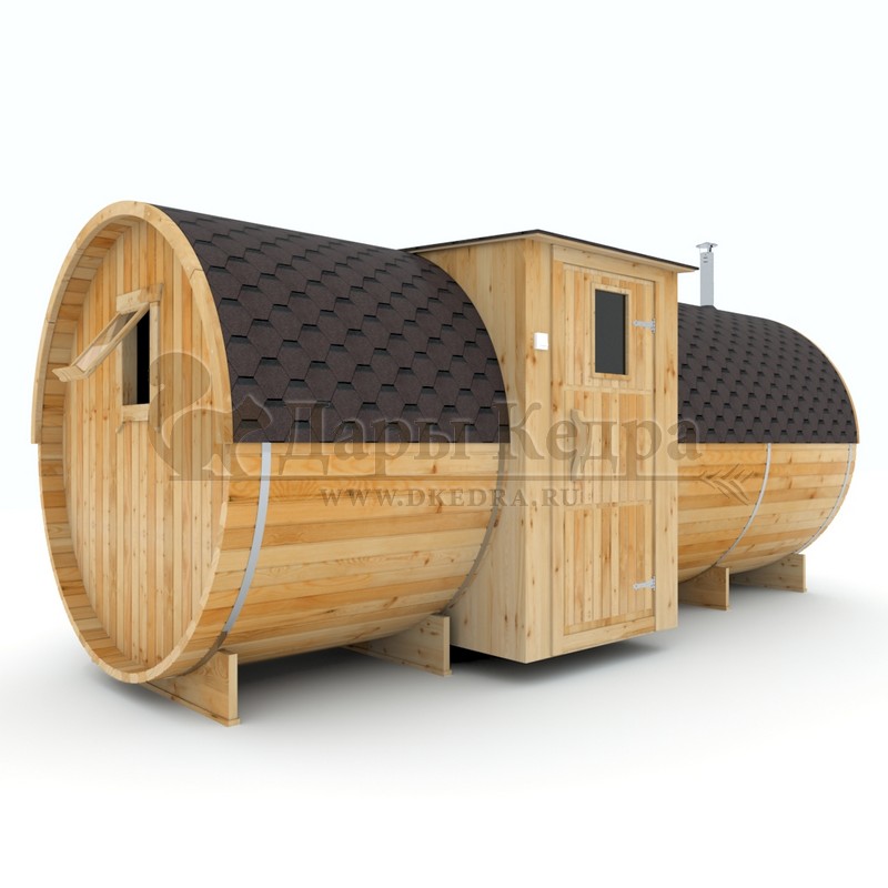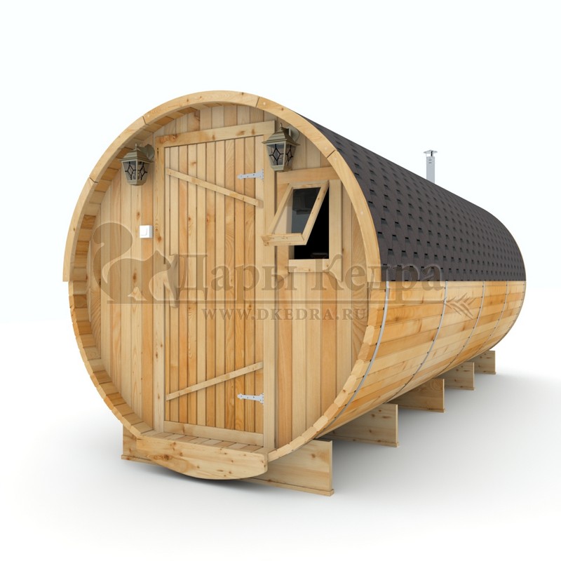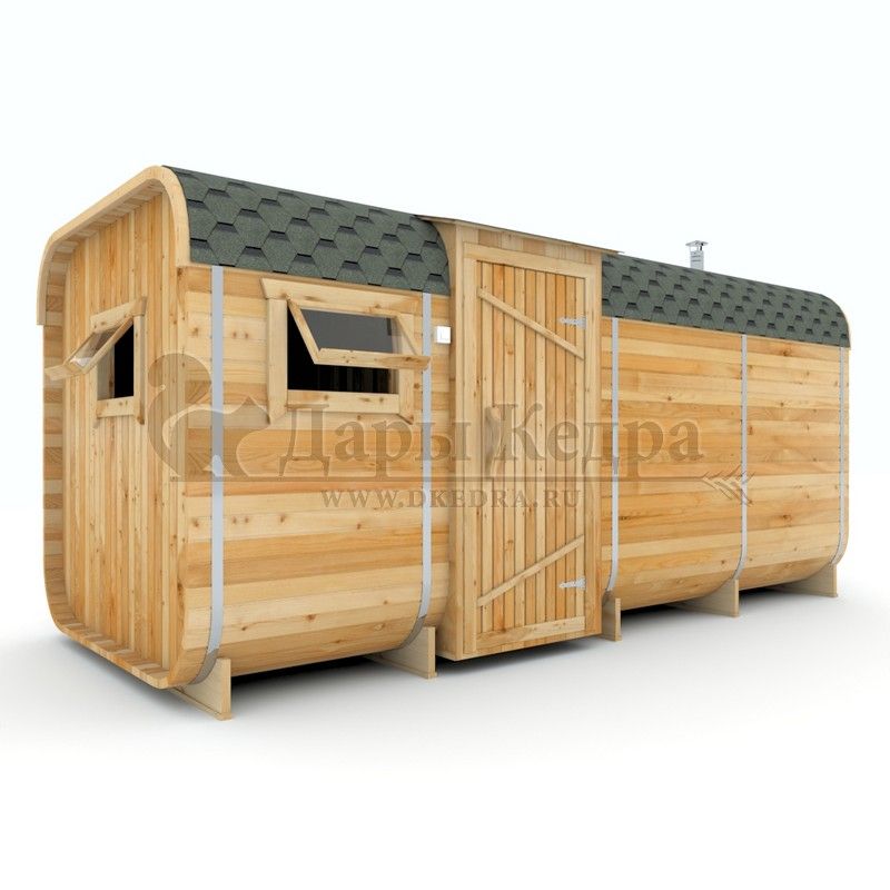 Баня-бочка буханка из кедра с боковым входом (все размеры) Это самая просторная модель бани. Благодаря этому ее можно использовать не только по назначению, но и в качестве летнего домика. Боковой вход у такой модели находится в начале или в середине конструкции. Моечная оснащена душевым поддоном. Двухуровневый открытый полок и лавочка в парилке сделает принятие процедур более комфортным. По вашему желанию баню-бочку можно дополнить печью с внешней загрузкой, благодаря которой весь мусор после топки останется на улице. Баня-бочка буханка из кедра с боковым входом не требует полноценный фундамент, поэтому при необходимости ее можно перенести в другое место. Обращаем Ваше внимание, что в стандартную комплектацию бани входят полки открытого типа в парной с обеих сторон. Дополнительно можно заказать полок закрытого типа или лавку! Кедр обладает ароматическими свойствами. Он не деформируется и влагоустойчив, при правильном уходе за деревом на нем не развиваются грибки и плесень.