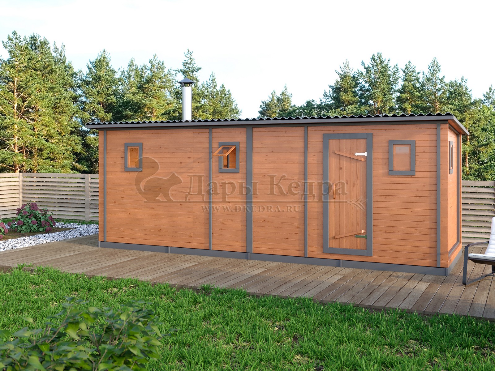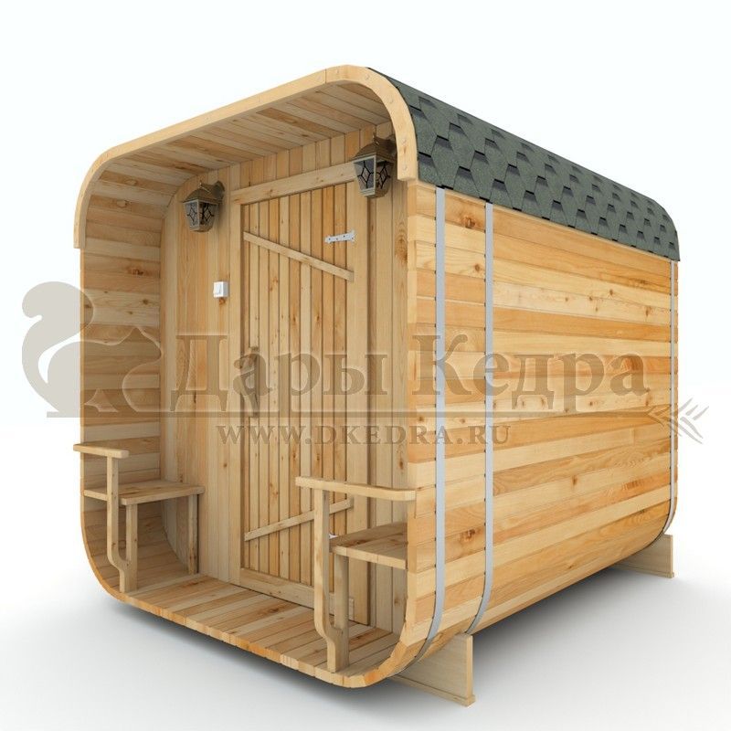 Баня-бочка квадро из кедра с козырьком (все размеры) Это прямоугольное изделие с закругленными углами. За счет такой конструкции во время топки воздух циркулирует по кругу, поэтому баня-бочка нагревается не более 30 минут. Козырек не только украшает баню, но и защищает оставленную обувь от дождя. Лавочки из кедра находятся по всей длине бани-бочки с обеих сторон. Печь расположена в парилке около дальней стены. В зависимости от выбранного размера баня-бочка квадро с козырьком имеет следующую комплектацию: Баня-бочка квадро 2,5 метра - парилка; Баня-бочка квадро 3,5 и 4,5 метра - раздевалка, парилка; Баня-бочка квадро 5,5 метров - раздевалка, парилка, моечная. По вашему желанию ее можно укомплектовать печью с внешней загрузкой, благодаря которой весь мусор вовремя топки остается на улице. Баня-бочка квадро не требует полноценный фундамент, поэтому при необходимости ее можно перенести в другое место. Обращаем Ваше внимание, что в стандартную комплектацию бани входят лавки в парной с обеих сторон. Дополнительно можно заказать полок открытого или закрытого типа! Кедр обладает ароматическими свойствами. Он не деформируется и влагоустойчив, при правильном уходе за деревом на нем не развиваются грибки и плесень. Обращаем Ваше внимание, что данную модель бани-бочки можно изготовить с ровным полом. Эта дополнительная опция и оплачивается отдельно!