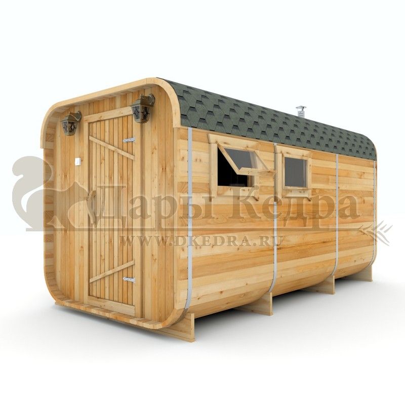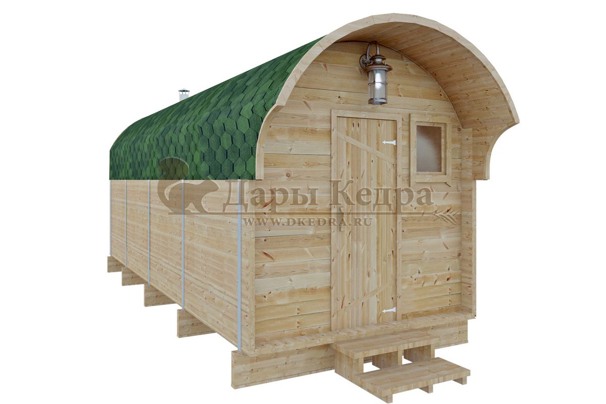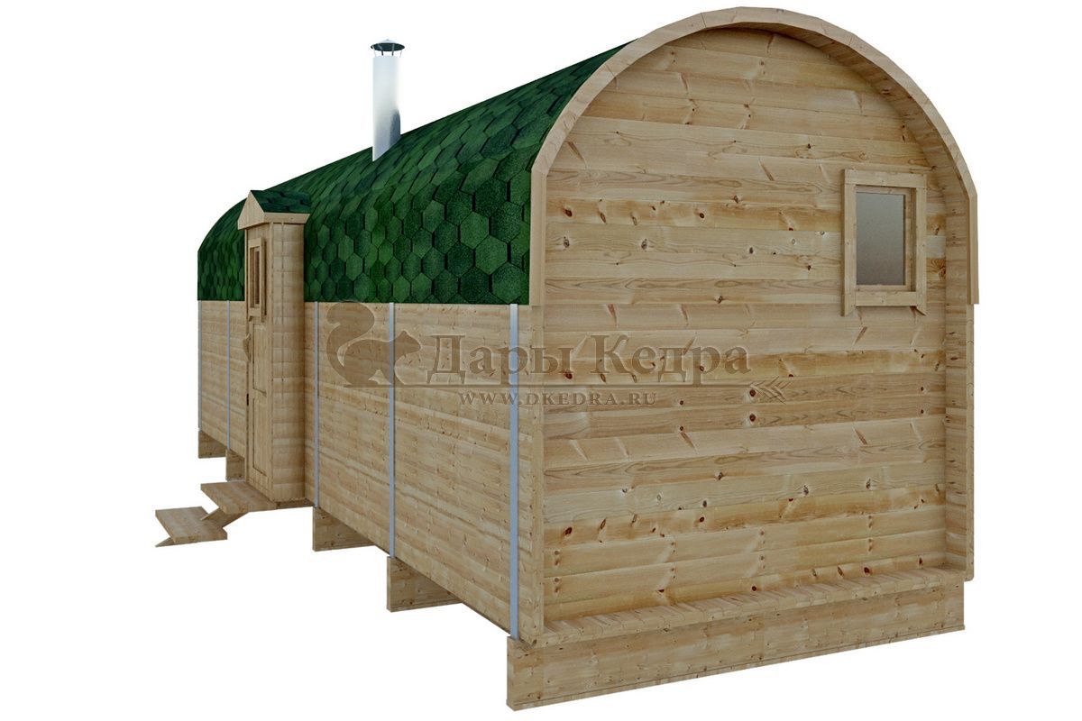 Баня-бочка буханка из кедра с козырьком (все размеры) Баня-буханка более просторная за счет увеличенной высоты потолков и ровного пола. Козырек не только украшает баню, но и защищает оставленную обувь от дождя. Лавочки из кедра находятся по всей длине бани-бочки с обеих сторон. Печь расположена в парилке около дальней стены. Время растопки такой бани не превышает 30 минут. В зависимости от выбранного размера баня-бочка буханка с козырьком имеет следующую комплектацию: Баня-бочка буханка 2,5 метра - парилка; Баня-бочка буханка 3,5 и 4,5 метра - раздевалка, парилка; Баня-бочка буханка 5,5 метров - раздевалка, парилка, моечная. По вашему желанию ее можно укомплектовать печью с внешней загрузкой, благодаря которой весь мусор вовремя топки остается на улице. Баня-бочка буханка не требует полноценный фундамент, поэтому при необходимости ее можно перенести в другое место. Обращаем Ваше внимание, что в стандартную комплектацию бани входят полки открытого типа в парной с обеих сторон. Дополнительно можно заказать полок закрытого типа или лавку! Кедр обладает ароматическими свойствами. Он не деформируется и влагоустойчив, при правильном уходе за деревом на нем не развиваются грибки и плесень.