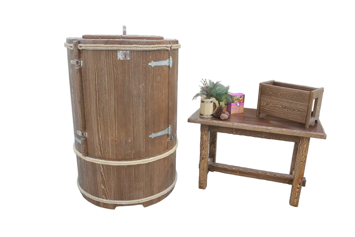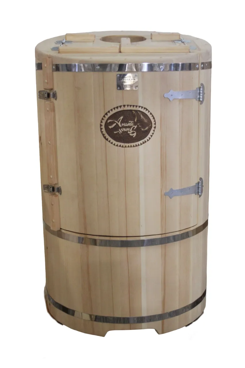 Фитобочка круглая двухрежимная может быть использована как инфракрасная сауна и парная. Карбоновые излучатели отвечают за сухое парение, они находятся на внутренней стороне стенки. Влажное парение происходит за счет поступления горячего пара в фитобочку через паропровод. Верхний скос изделия улучшает видимость и делает положение головы более комфортным. Бочка оборудована откидными створками, дверцей и отверстием для головы. Во время парения человек сидит внутри кедровой бочки, а голова находится снаружи. Благодаря этому исключается возможность перегрева. Подлокотники из кедра, встроенные ручки на створках и двери делают эксплуатацию более удобной.