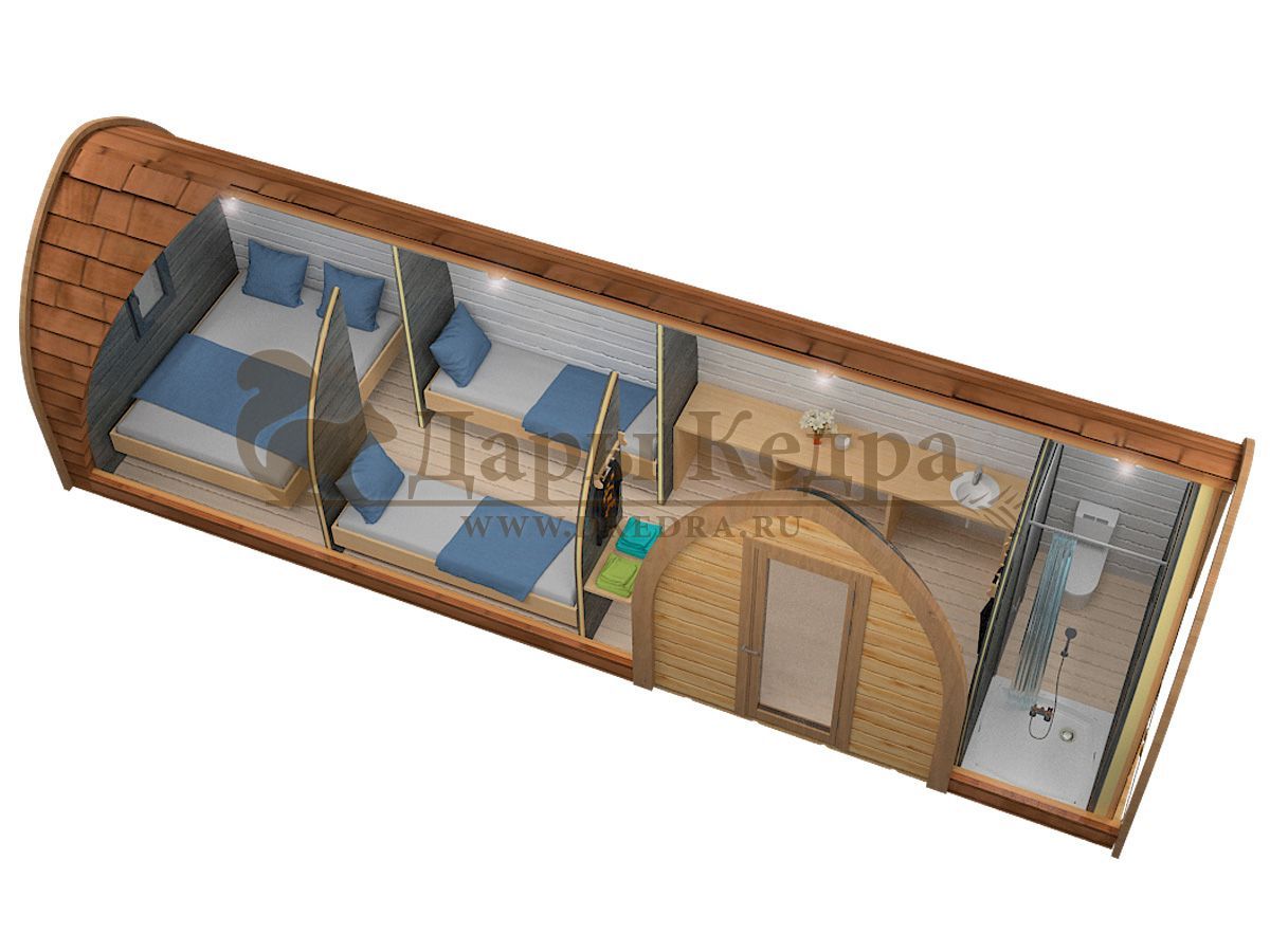 Самый просторный кемпинг дом. Подходит для дачного использования или обустройства загородных баз отдыха. Увеличенные размеры и боковой вход со стеклянной дверью позволяют зонировать внутреннее пространство помещения. Домик включает в себя: