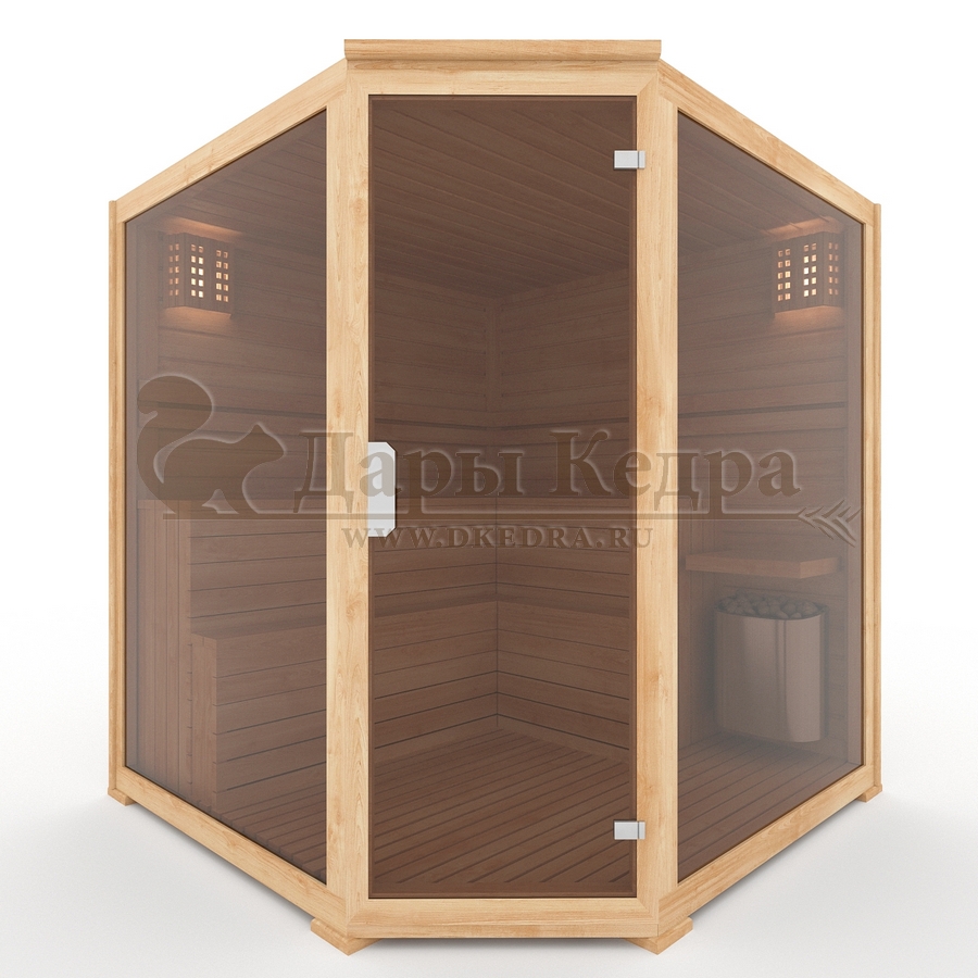 • Пятиместная угловая финская сауна кабина из кедра с электрокаменкой Это специально оборудованная деревянная кабина для сухого и влажного парения. Электропечь нагревает пространство внутри и позволяет сбрызгивать камни водой, слегка увлажняя воздух. Такая процедура позволяет избежать перегрева. Двойные стенки кабины с теплоизоляционным материалом удерживают тепло. Установка сауны в угол позволяет рационально использовать пространство помещения. Финская сауна с электропечью подойдет, как для домашнего использования, так и для коммерции. Доставляется в разборном виде щитами, собирается по инструкции с помощью шуруповёрта. Обращаем Ваше внимание, что в стоимость сауны уже включена дверь с закаленным стеклом в раме из кедра с фиксатором и деревянным фасадом справа. Вы можете заменить фасад на цельностеклянный с безрамной дверью за дополнительную плату. Нагреваясь, древесина кедра выделяет полезные вещества-фитонциды, которые благотворно влияют на организм в целом и укрепляют иммунитет.